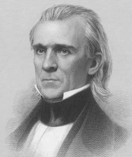 1849年2月17日、ホワイトハウスで撮影。左からアイザック・トーシー司法長官(在任=1848年6月21日~1849年3月3日。後に第15代ブキャナン政権で海軍長官)、ロバート・ウォーカー財務長官、ポーク大統領、ジェームズ・ブキャナン国務長官(後の第15代大統領)、ジョン・メーソン海軍長官(在任=1846年9月10日~1849年3月4日)。