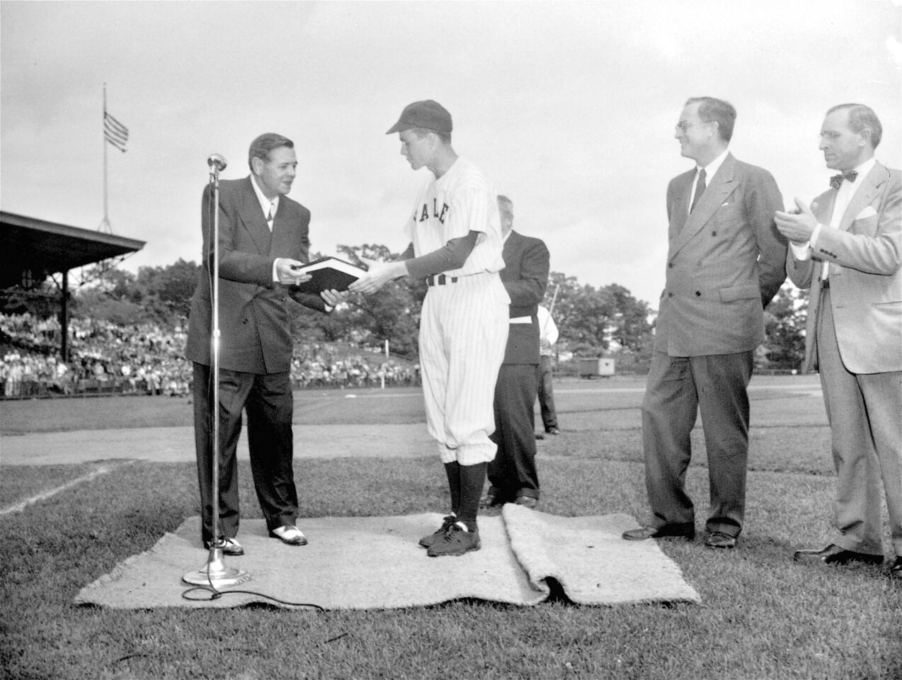 1948年、エール大学野球部キャプテンの第41代父ブッシュが、自叙伝の原稿を寄贈するため同校を訪れたベーブ・ルースと試合前の贈呈式に臨んでいる。父ブッシュは「最終学年の大きな出来事」と回顧している。第41代父ブッシュ大統領著、吉澤泰治氏訳「未来を見つめて」(1989年、KKダイナミックセラーズ社発行)PP.78-82。