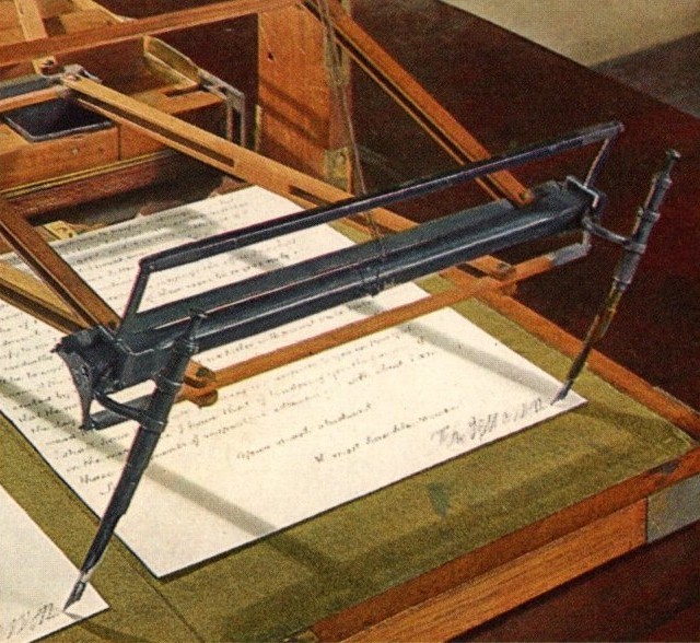 ・ポリグラフ。ペンを動かして正文を書くとポリグラフの針が動いてその写し書く。ジェファソンがアイディアを提供したこの器具をジェファソンは当時の「最もみごとな発見」と自賛した。ホームページ「モンティセロ」のポリグラフ説明はこちら。